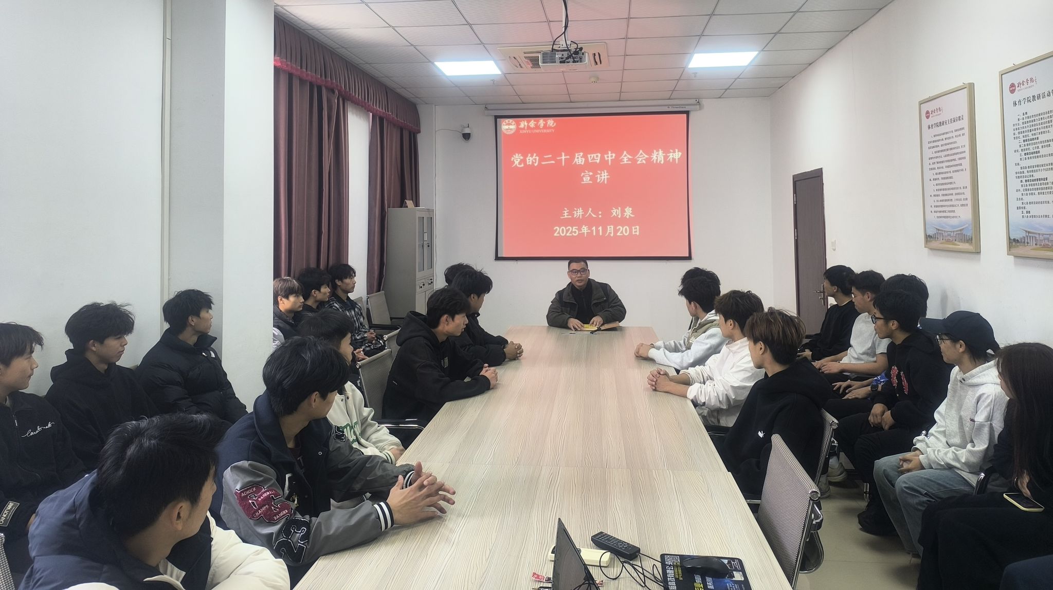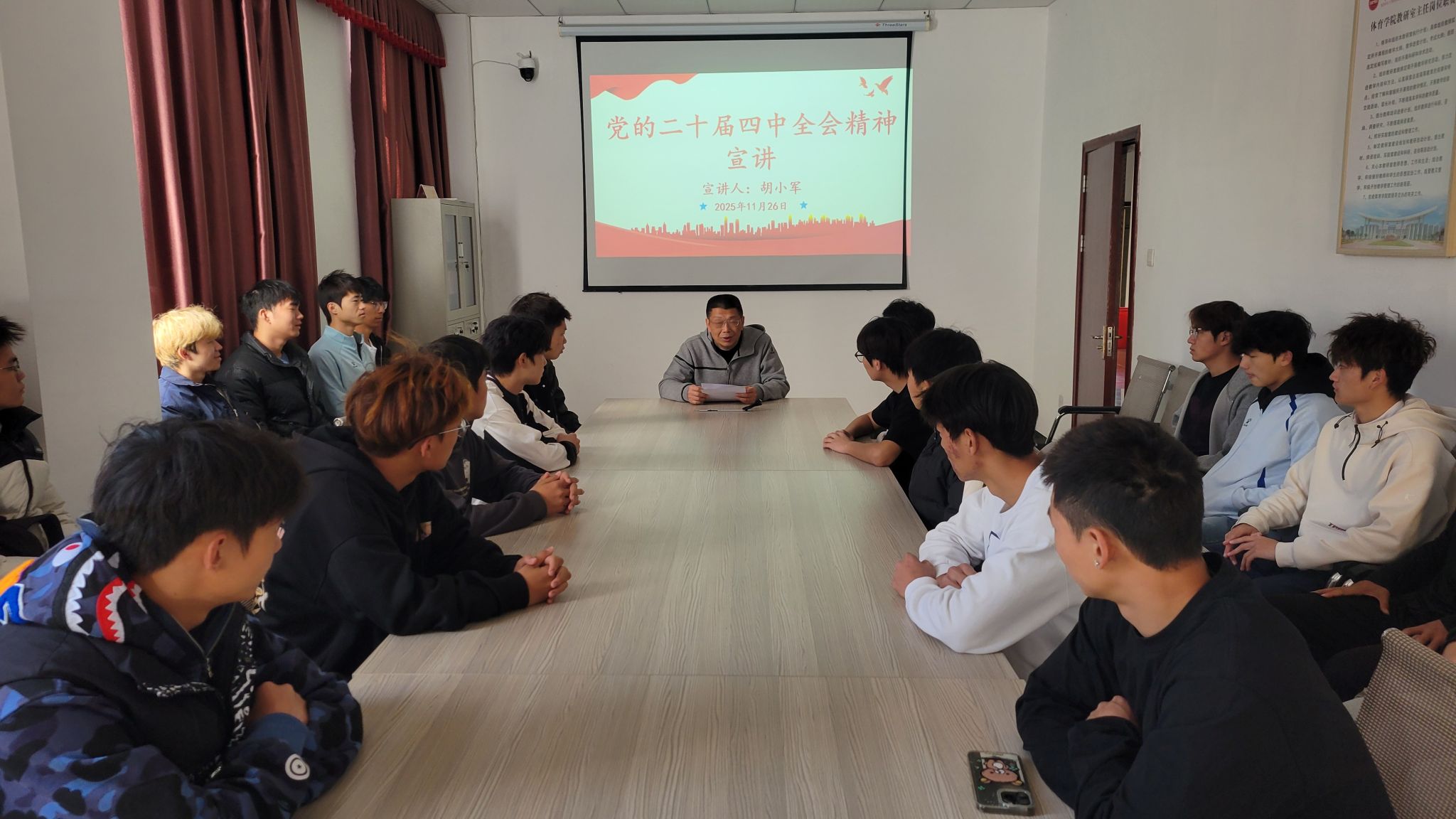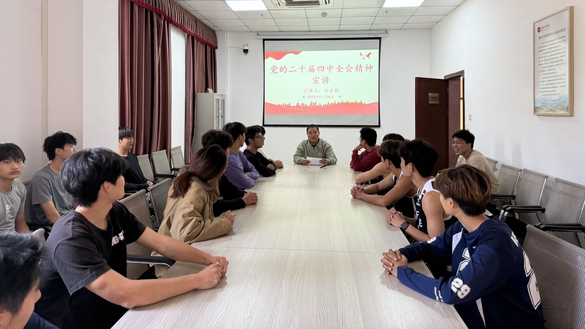 11月20日,党委副书记刘泉以《深学全会精神 勇担青春使命——做新时代体育青年追梦人》为题,向25级体教1班学生开展专题宣讲。他紧密结合习近平总书记关于青年工作的重要思想,解读了全会对青年一代的殷切期望,强调青年体育学子要将个人成长与体育强国建设紧密结合,鼓励学生通过运动训练、学科竞赛等锤炼专业技能,夯实专业基础,展现体育青年的昂扬风貌。
