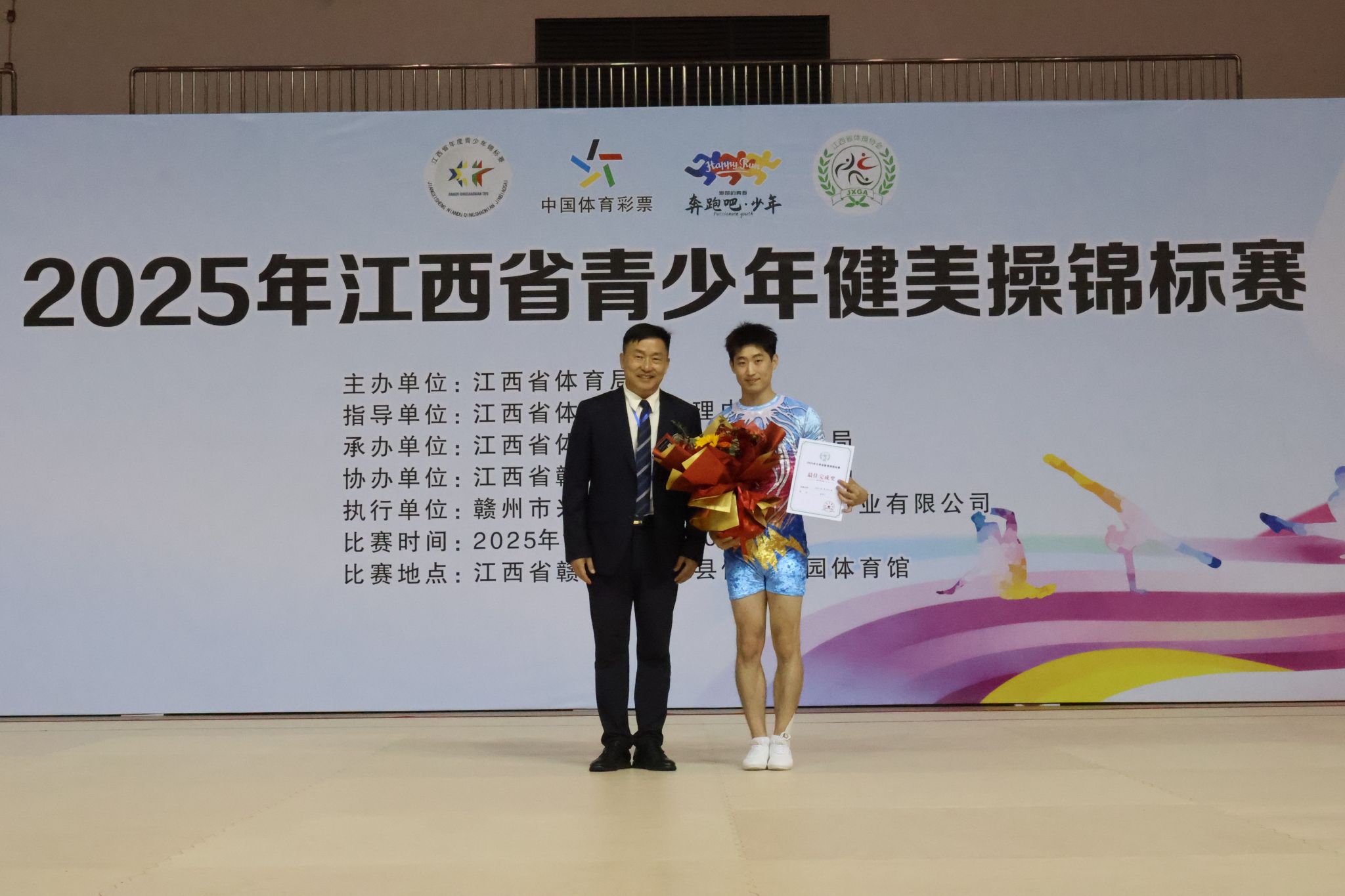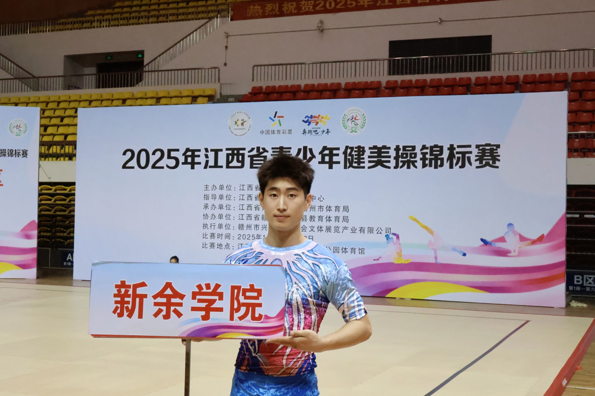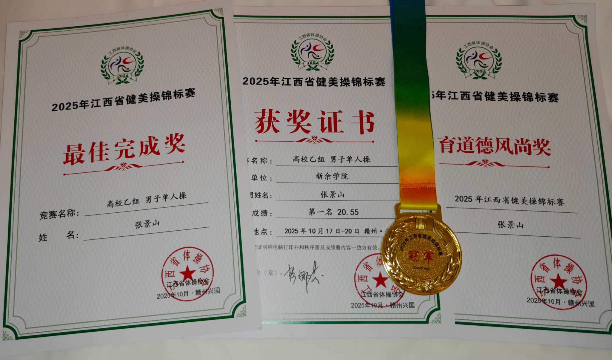 10月19日,由江西省体育局主办的2025年江西省青少年健美操锦标赛在赣州兴国圆满落幕,我院青年教师张景山凭借优异的表现,一举斩获高校乙组男子单人操冠军,同时获得最佳完成奖和体育道德风尚奖,为学校赢得荣誉。